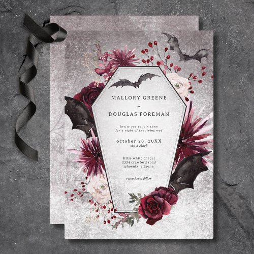 A Halloween or gothic-inspired wedding doesn’t have to mean costumes and candy (though it can if you want!). Think black lace, deep burgundy florals, vintage candelabras, and candlelit receptions. It’s all about the atmosphere — and your invitations can be the first clue for your guests.